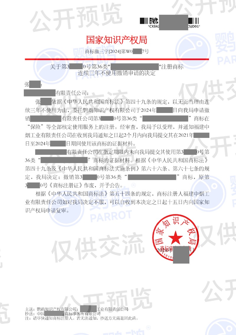 本文《关于第3****0号第36类"****"注册商标连续三年不使用撤销申请的决定》的素材转载自网络,涉及的文字、图片及其他作品的版权归原作者所有。如本文中引用的信息涉及第三方权益,可能存在侵权或其他法律风险,请及时与我们联系,以便进行修改或删除。本文内容仅为传递节日祝福、法律知识、新闻动态和企业管理经验之目的,仅供参考。我们尊重作者的观点或立场,但其观点或立场不代表本单位/网站的认可,也不构成本单位/网站的意见或立场。