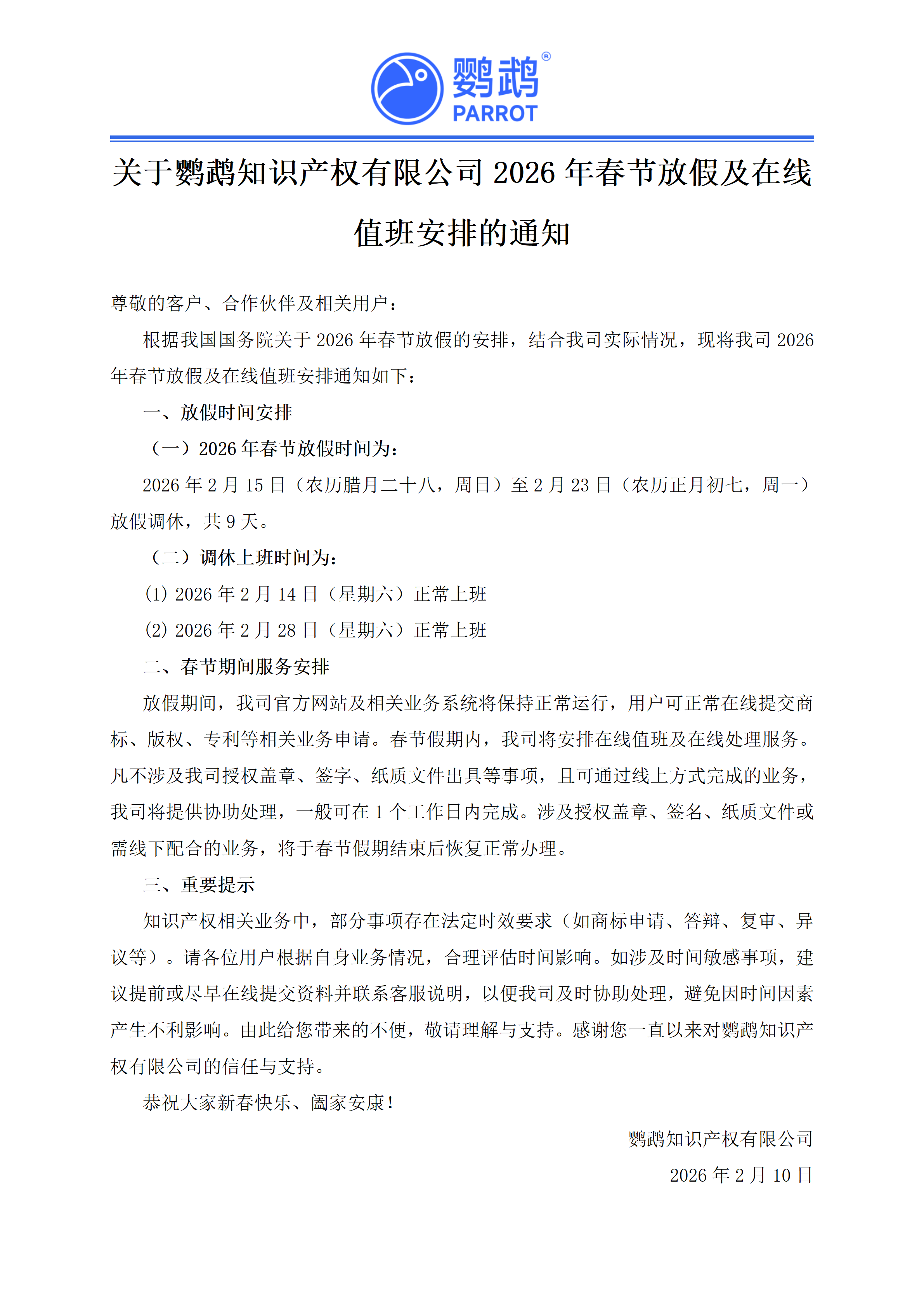 本文《关于我司2026年春节放假及在线值班安排的通知》的素材转载自网络,涉及的文字、图片及其他作品的版权归原作者所有。如本文中引用的信息涉及第三方权益,可能存在侵权或其他法律风险,请及时与我们联系,以便进行修改或删除。本文内容仅为传递节日祝福、法律知识、新闻动态和企业管理经验之目的,仅供参考。我们尊重作者的观点或立场,但其观点或立场不代表本单位/网站的认可,也不构成本单位/网站的意见或立场。