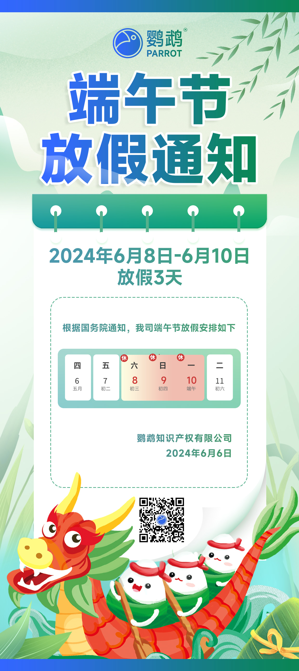 根据国务院的放假安排,我司将在2024年6月8日至6月10日端午节放假。放假期间,鹦鹉知识产权网 yingwu.net 将24小时不打烊,为用户提供持续的在线知识产权代理服务。您可以随时使用该网站自助在线提交商标版权注册申请,并享受在线客服的支持。